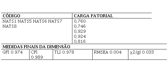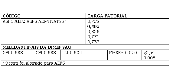 A AFC iniciou pela dimensão autoeficácia, que teve acrescida na análise o item NATS2. Para o modelo ajustado, optou-se pela exclusão de AEF2 por apresentar carga fatorial menor que 0,7. A dimensão apresenta medidas finais dentro dos padrões estabelecidos, conforme Tabela 7.