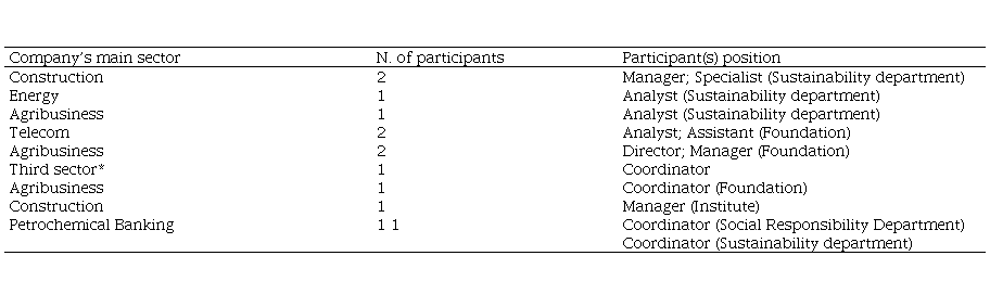 First, we conducted a focus group with 13 Brazilian corporate social managers from ten companies belonging to seven different sectors (Table 1). According to Bloor and colleagues, “focus groups can be used for the generation of information on collective views”, but also “will provide rich data on the group meanings associated with a given issue” (2002:4). Focus groups emphasize a specific theme or topic and the ways in which individuals discuss a certain issue as members of a group (Bryman, 2012). We facilitated the discussion that lasted three hours and 30 minutes.