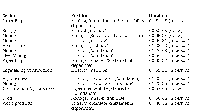 We considered the Iceberg model as a suitable procedure for the focus group due its capacity to incorporate a systems perspective, which is important to frame questions and make sense out of qualitative data (Patton, 2001). In total, 13 one-to-one semi-structured interviews were carried out with corporate social managers (Table 2). The interviews lasted between 40 minutes and one hour and 26 minutes and were conducted in Portuguese, audio-recorded and transcribed.