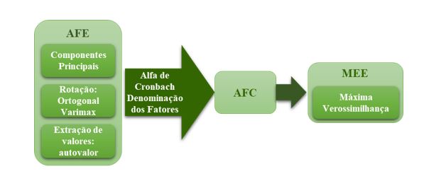 A análise fatorial exploratória foi realizada por meio do software SPSS versão 23, utilizando o método dos componentes principais com extração de fatores com base no autovalor e rotação ortogonal pelo método Varimax. A adequação da amostra foi dada pelo teste KMO (Kaiser-Meyer-Olkin) e a adequação dos dados pelo teste de esfericidade de Bartlett que indicou correlações significativas entre as variáveis. Após a extração dos fatores foi verificada a consistência interna por meio do Alfa de Cronbach. Após a denominação dos fatores pela Análise Fatorial Exploratória (AFE)[i], realizou-se um teste confirmatório por meio da Análise Fatorial Confirmatória (AFC)[ii] e continuou-se a testagem do modelo estrutural por meio da Modelagem de Equações Estruturais (MEE) utilizando o pacote estatístico Amos 21 e selecionando o método de estimação de Máxima Verossimilhança (ML), conforme ilustra a Figura 1.