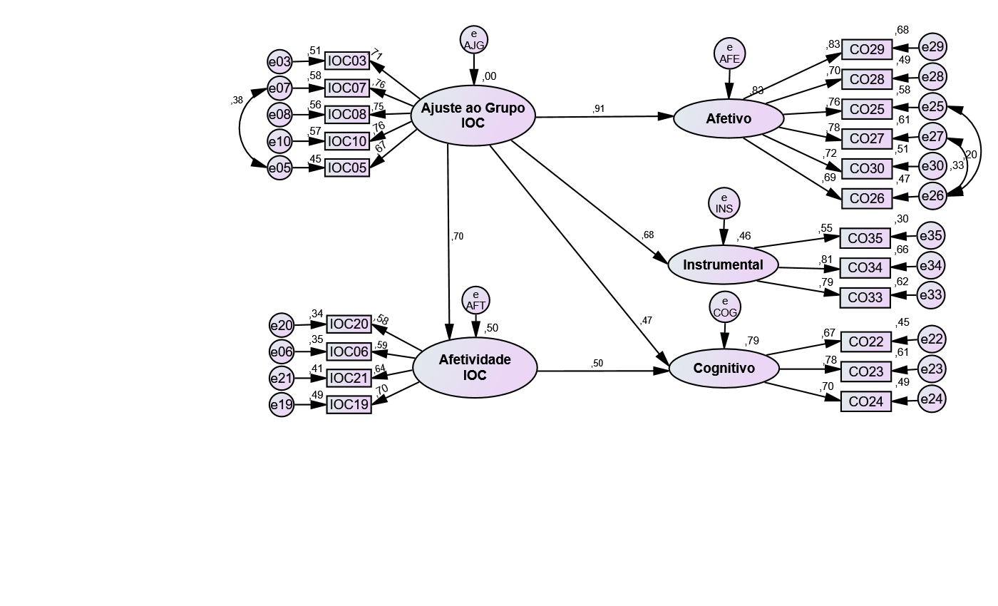 Com o intuito de melhorar os índices de ajustamento do modelo foram inseridas correlações entre os erros da variável IOC19 (e19) e do construto Cognitivo (eCOG) que, embora sejam de construtos diferentes, estão relacionados teoricamente. Além desses ajustes, o Amos sugeriu inserir uma correlação entre os erros dos construtos de Ajuste ao Grupo e Afetividade. Porém, como ocorreu na análise do primeiro caminho, optou-se por inserir uma relação de influência devido ao fato de serem indicadores distintos.