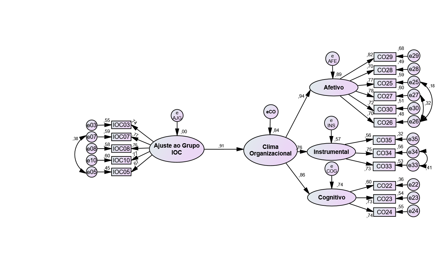 Assim, a dimensão que mais influenciou o Clima Organizacional foi a de Ajuste ao Grupo (IOC), agindo nos três aspectos do Clima Organizacional – Afetivo, Instrumental e Cognitivo. Na validação do modelo integrado, o modelo inicial recebeu os ajustes de acordo com a análise de caminhos estruturais e com os índices de modificação sugerido pelo Amos. Todas as alterações foram fundamentadas teoricamente.