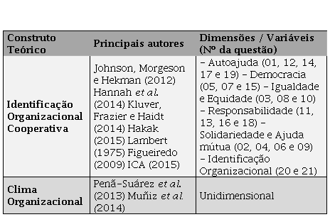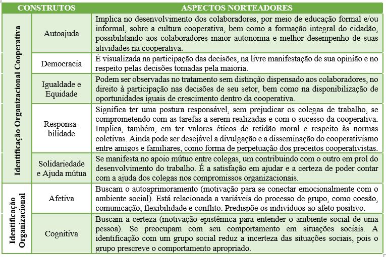 O construto de Identificação Organizacional Cooperativa foi elaborado a partir da Teoria da Identidade Organizacional (Ashforth & Mael, 1989) e da Declaração sobre a Identidade, Valores e Princípios do Cooperativismo (International Co-operative Alliance, 2015).