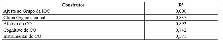 Hair et al. (2009) recomendam o exame das estimativas de variância explicada para os construtos endógenos (R²). Em Modelagem de Equações Estruturais essa estatística é dada pela Correlação Múltipla Quadrática, apresentada na Tabela 4.