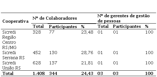 A pesquisa teve como objeto de estudo os colaboradores e gerentes de gestão de pessoas que atuam nas cooperativas de crédito Sicredi Região Centro RS/MG, Sicredi Serrana RS e Sicredi União RS. A escolha dessas cooperativas se justifica por empregar 1.408 colaboradores, em 80 municípios do Rio Grande do Sul.
