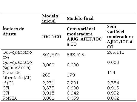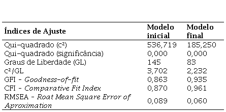 Verificou-se que o modelo final satisfaz aos índices de ajustes mais utilizados. Salienta-se que foram realizados apenas as alterações necessárias ao atendimento dos índices de ajuste, a fim de preservar a integridade teórica do construto.