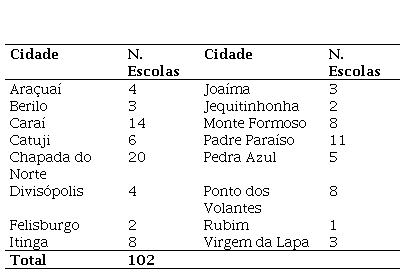 Em Minas Gerais, o semiárido é compreendido nas regiões norte do estado e do Vale do Jequitinhonha, onde vivem 1.492.198 pessoas, e compreende 91 municípios em uma área de 121.259 Km² (Superintendência do Desenvolvimento do Nordeste [SUDENE], 2018). Neste estudo, nos restringimos às regiões dos vales do Jequitinhonha e do Mucuri do referido estado, que também fazem parte da área de delimitação da SUDENE, portanto, também contempladas pelo Programa Cisternas nas Escolas. Diante do escopo desta pesquisa, que contou com uma etapa de análise qualitativa e em profundidade, foi necessário fazer um recorte geográfico do campo atendido pelo Programa. A opção pela região citada deu-se pela maior facilidade para o acesso dos pesquisadores aos sujeitos da pesquisa.