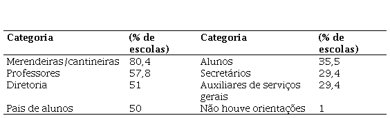 Da perspectiva de Dietrich (2019) e da ASA (2020), uma das etapas cruciais para o Programa é a de orientação para manejo da cisterna e da água nela armazenada. Nessa etapa, torna-se crucial a participação de diferentes profissionais responsáveis pela gestão da água na escola. No campo estudado, os respondentes afirmaram que a categoria das merendeiras/cantineiras foi a mais envolvida nessa etapa (80,4% das escolas). As demais categorias citadas como mais envolvidas foram: professores (em 57,8% das escolas); diretoria (51%); pais de alunos (50%); alunos (35,3%); auxiliares de serviços gerais (29,4%); e secretários (29,4%). Por apenas uma escola foi afirmado que não houve orientações nessa etapa. Esses percentuais demostram que deveria haver maior envolvimento de alguns profissionais na etapa de orientações, principalmente dos auxiliares de serviços gerais, diante da constatação que são os principais responsáveis pelos cuidados para manutenção da cisterna (em 41,2% das escolas).