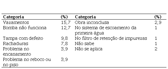 Dentre os problemas relatados, estão: vazamentos (15,7%); bomba de água que não funciona (12,7%); tampa da cisterna com defeito (9,8%); rachaduras (7,8%); dentre outros apontados na Tabela 4.