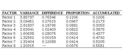 The exploratory factor analysis identified the significant dimensions in the set of variables (Damásio, 2012), with low correlatins. The KMO test (Kaiser-Meyer-Olkin) obtained a result of 0.841 (greater than 0.8), which indicates an excellent degree of correlation between the variables. Bartlett's test of sphericity, with a result of 0.000 (less than 0.05), suggested the adequacy of data, enabling the execution of the exploratory analysis. Data obtained after using the factorial rotation process (orthogonal Varimax) provided a better interpretation solution, eliminated some variables, and identified eight factors from a statistical correlation pattern (Damásio, 2012; Hair et al., 2009). The "common variance" of the factors presented in Table 1 shows the portion of variance that the variables share among themselves in their results (Damásio, 2012).