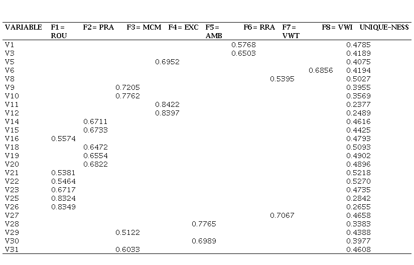 Although there is no consensual criterion to define how many factors should be extracted, the literature points out some methods that can help the researcher when making this decision. We opted for the eigenvalue (eigenvalue) rule which suggests that only factors with an eigenvalue above one should be extracted. A low eigenvalue case would contribute little to explain the variance in the original variables. We support our decision in Tabachinick, Fidell and Ullman (2007). The six guidelines of the NHP presented previously were based on Atenttion, Management and Co-management, Ambience, Expanded Clinic, Rights of Users, and Valuing Workers. The exploratory factor analysis identified eight factors, four of which are coherent with the NHP and another four as improvements of the other two factors of the NHP. Thus, the Attention construct was subdivided into Professional Attention (PRA) and Relational Attention (RRA), while the Valuing Workers construct split into Technical Worker Valorization (VWT) and Worker Insertion Valorization (VWI). Table 2 shows the load factores and the uniqueness of each variable (communalities = 1 – uniqueness). The latter ideally should be less than 0.5 and the load factors greater than 0.4 (Damásio, 2012, Hair et al., 2009). In the process the variables V2, V7, V13, V17, V24, and V32 were excluded using a greater cut of 0.5 for the load factor and accepeting communalities bellow 0.5. Researchers may consider eliminating such variables in other research contexts, however for the purpose of this study, a variable with a significant charge can still be accepted in the factor solution (Hair et al., 2009). So, jointly, those criteria revealed the variables in each of the eight factors.