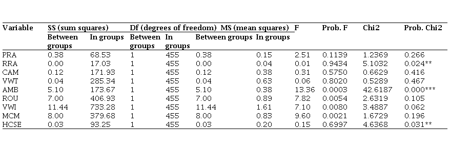 Table 3 shows that there is evidence that the sum of squares in all constructs of the model is lower among groups of users and professionals than within groups, which suggests a wide variation in responses, especially within the VWI, ROU, GCG, and AMB constructs, which affects the F statistic. These results reinforce the conclusions on the differences in perception between users and professionals about aspects related to humanization in healthcare (Falk et al., 2010).