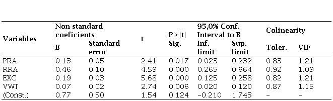 Thus, the results show that there are differences in the perception of users and healthcare professionals in the constructs AMB - Ambiance, MCM - Management and Co-management, ROU – Rights of Users, and VWI - Valuing Workers' Insertion. The other constructs did not show significant differences between groups, as also identified in the average tests performed. At this point, it is relevant to highlight that the results might be consequence of the sample’s sociodemografic composition, i.e., the geographic location of the respondent.The estimation method was stepwise, which adds or removes variables to select the most appropriate subset for the analysis. The test was run with all variables and excluded GCG, ROU, VWI, and AMB. Thus, only the explanatory variables with a significance level of 1% and 5% remained in the model: Professional Attention (PRA), Relational Attention (RRA), Expanded Clinic (EXC), and Technical Enhancement of the Worker (VWT). All are positively related to healthcare services' effectiveness, with Relational Attention (PRA) having a more significant effect on humanization (46%), as shown in Table 4.