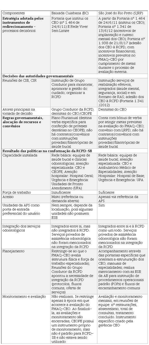 A estratégia estabelecida a partir dos instrumentos de redirecionamento incluía, para ambas as regiões, a adoção da Portaria que instituiu a RCPD no SUS (n. 793, 2012), a qual preconizava, dentre outras coisas, respeito aos direitos humanos, cuidado integral, garantia de acesso e de qualidade dos serviços e sua organização em redes de atenção regionalizadas. Nos planos estadual e regional, a estratégia adotada pela BC nos seus espaços decisórios incluiu a instituição de Grupo Condutor para monitorar, aprimorar a gestão do cuidado e organizar a RCPD, seguindo a orientação do Plano Viver Sem Limite. Também foi aprovado o Plano de Ação da RCPD para o estado do Mato Grosso, mas não foi incluído entre seus indicadores, metas e ações referentes à saúde bucal. Para SJRP, a estratégia a partir de instrumentos de redirecionamento incluiu a instituição de serviços de reabilitação efetivos, integrados (saúde mental, segurança, social) e em formato de redes de atenção à saúde (conforme orienta o Plano Estadual da Pessoa com Deficiência) e a adesão dos CEO à RCPD (Portaria n. 1.341, 2012).