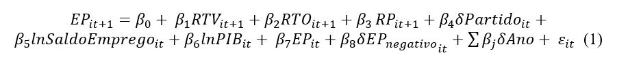 No qual EPit+1 indica o erro de previsão no período t+1; RTVit+1 são as receitas de transferências voluntárias no período t+1; RTOit+1 são as receitas de transferências obrigatórias no período t+1; RPit+1 indica as receitas próprias dos municípios no período t+1; δPartidoit indica a variável dicotômica que assume valor 1, caso o partido do prefeito seja o mesmo do presidente, e 0 caso contrário; lnSaldoEmpregoit indica o logarítmo natural do saldo anual agregado de empregos nos municípios; lnPIBit indica o logaritmo natural do Produto Interno Bruto; EPit o erro de previsão de receitas; δEPnegativoit uma variável dicotômica que assume valor 1, caso a receita prevista seja menor que a realizada, e 0 caso contrário; δAno variáveis para controle de período.