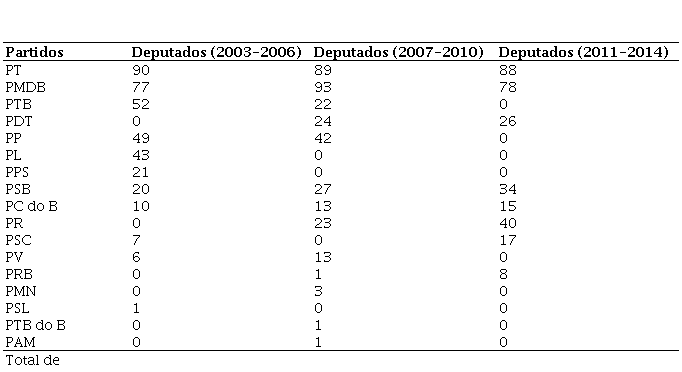 Na legislatura seguinte (2007-2010), 13 partidos, dos 21 representados no congresso, totalizando 352 deputados, compuseram a base de apoio do Presidente Lula. Já na gestão da Presidente Dilma, foram oito partidos que compunham sua base de apoio, com 22 partidos representados no congresso (Tabela 2 e Figura 16).