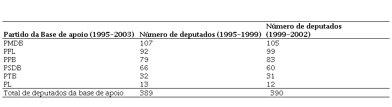 Em relação à governabilidade, FHC aprovou diversas medidas no CN sem muitos problemas, assegurando a governabilidade da coalizão nos seus dois mandatos, pois contava apenas com seis partidos na base de apoio na Câmara e no Senado para lhe dar maioria tanto em Projeto de Emenda Constitucional (PEC), quanto em Medida Provisória (MP). Na Câmara, sobretudo, como é sempre mais crítica a busca do apoio, esses seis partidos perfaziam o número para se obter maioria para aprovação de PEC, que requeria 308 votos, e em plenário ou de MP, que requeria maioria simples em plenário (Tabela 1).