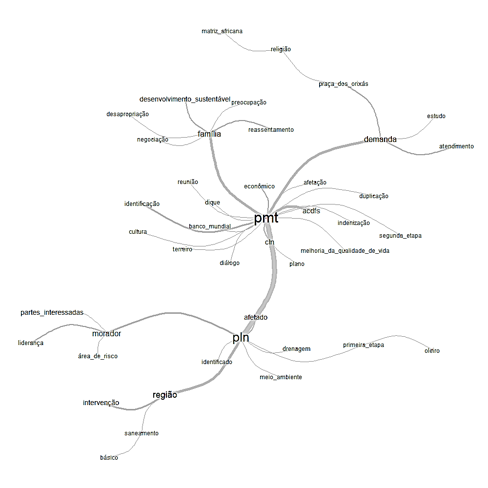Os resultados das análises corroboram com as demais dimensões relativas ao tema do reassentamento obrigatório, que gera bastante conflito entre a população e a prefeitura. Sugere-se, portanto, que a execução do PLN utilize os princípios propostos por Ruggie (2014): Proteger (proteção dos Estados); Respeitar (respeito provido pelas organizações) e; Reparar (mecanismos de indenização das vítimas), formando uma possibilidade maior de empoderamento. A Figura 6 evidencia a análise de similitude dos entrevistados.