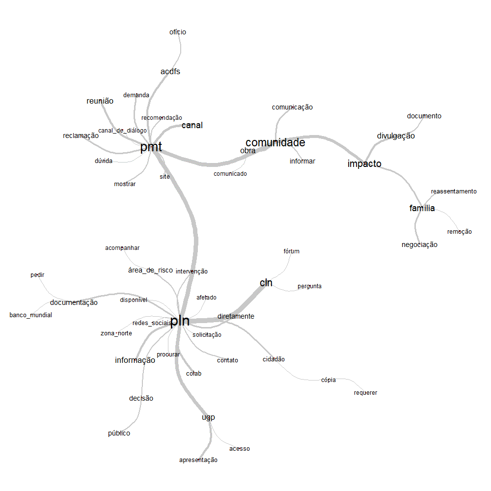 As análises acerca da transparência das informações revelam que a PMT precisa conferir uma maior transparência sobre as informações do PLN. Notou-se uma pressão social por mais transparência nas ações realizadas pelos gestores, tendo em vista os possíveis impactos negativos causados ao meio ambiente e à sociedade (Melo & Melo, 2017). Dessa forma, para esse caso específico, a transparência representou uma relação ética e respeitosa da gestão pública com todos os públicos atingidos pelo PLN (Instituto Ethos, 2013). As entrevistas evidenciaram uma dificuldade em localizar informações. Esse fato corrobora a análise da accountability, no qual se notou a importância de outras instituições para aumentar o controle e a transparência da política pública (Menezes, 2015). A Figura 4 apresenta, os termos “comunidade”, “informar” em conexão com “impacto”, “documento”, “divulgação”, “família”, “reassentamento” e “remoção”, indicando que existem os documentos com os impactos, necessitando apenas de mais divulgação e informação à comunidade, de acordo com as falas dos entrevistados. Os achados deste estudo corroboram os resultados de Milani e Loureiro (2013), em relação à interpretação das instruções e a falta de clareza e transparência nas informações prestadas.