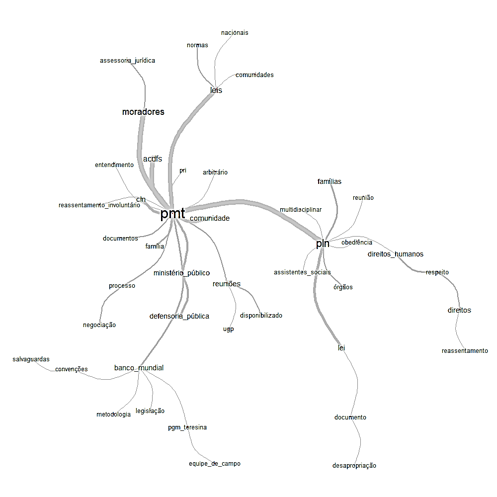 O vocábulo “arbitrário” também apresenta uma conexão com “PMT”, na Figura 5. Esse achado leva a entender que as algumas ações do poder municipal ocorreram de forma arbitrária. Nas entrevistas foi possível identificar eventos em que a comunidade não se sentiu participante do processo, compreendendo que, nesses casos, as decisões foram “de cima para baixo” (Mosse, 2005).