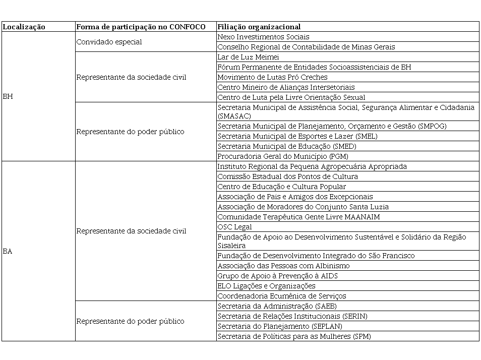 Apesar de se tratar de um município e de um estado, os casos de BH e BA – cujos CONFOCOs são os primeiros e únicos funcionando regularmente no momento de realização da pesquisa – foram selecionados em razão do alto nível de mobilização e participação do poder público e da sociedade civil nas primeiras etapas da implementação do MROSC até sua efetiva regulamentação (Mendonça, 2017). Dado o objetivo do trabalho, que é compreender como as dinâmicas organizacionais Estado-sociedade, influenciadas por diferentes lógicas institucionais, levam a diferentes resultados coproduzidos visando à implementação do MROSC, tem-se que os resultados são observáveis independentemente do recorte da federação que se pretende estudar.