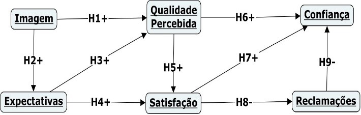 O resultado confirmou que a imagem antecede a qualidade percebida (Fornell et al., 1996; Andreassen & Lindestad, 1998) e impulsiona as expectativas (Bayol et al., 2000). E confirmou também que a qualidade percebida é um dos principais impulsionadores da satisfação (Andreassen & Lindestad, 1998; Bayol et al., 2000; Bei & Chiao, 2001). O resultado também confirmou que a satisfação de fato impulsiona a confiança, como sugerem Bryant, Fornell e Morgeson (2008) e que ao mesmo tempo reduz a tendência a reclamações. Das nove hipóteses de pesquisa, apenas a hipótese de que as reclamações deveriam reduzir a confiança (H9) não se confirmou por falta de significância estatística.