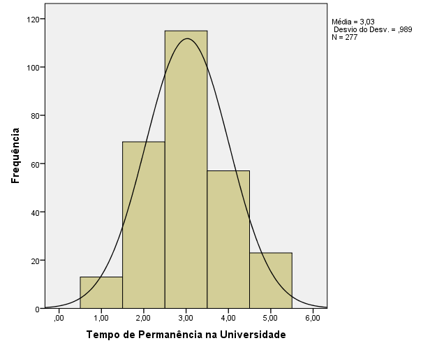 Conforme se vê na Figura 2, a amostra apresenta uma concentração significativa de respondentes (χ2 = 118,9; GL = 4; Sig = 0,000) nos anos intermediários, especialmente na 3ª faixa, que vai de dois a três anos de vivência acadêmica, uma quase normalidade que nem mesmo era esperada, tendo em vista que se tratava de uma amostra de conveniência.