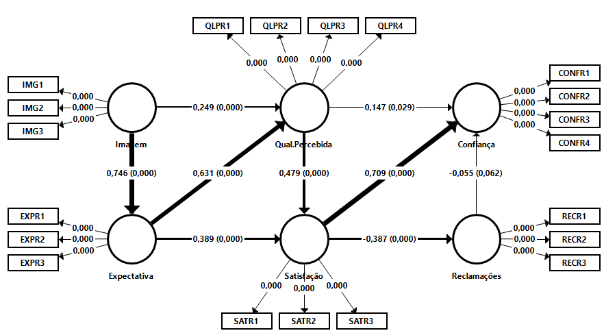 O modelo estrutural foi codificado no Smart-PLS-3.3.3 (Ringle, Wende, & Becker, 2015) e estimado em dois tempos: na primeira rodada foram estimadas as cargas fatoriais do modelo de mensuração (outer model) e do modelo estrutural (inner model); e na segunda fase foram estimadas as significâncias das relações através do t bootstrapping (1.000 repetições). Para facilitar a intepretação, os valores de . foram estimados e inseridos na Figura 3 entre parênteses, abaixo das cargas fatoriais correspondentes. Como se vê na figura, com exceção da relação Reclamações à Confiança, cujo t bootstrapping apresentou valor inferior ao mínimo de 1,96 (P. Pinto, 2016), todas as demais relações estruturais apresentaram significância estatística.