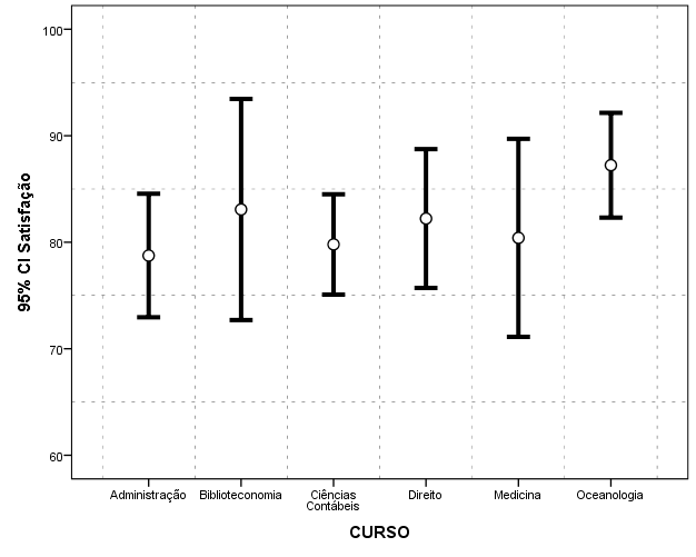 Após a estimação dos intervalos de confiança, os índices de satisfação dos cursos escolhidos para esta demonstração foram analisados e plotados em gráfico de máximos e mínimos (Figura 4) para facilitar a visualização. O resultado sugere que os estudantes, de modo geral, estão bastante satisfeitos com a instituição na qual estudam, tendo em vista que os índices de satisfação variam de 78,8 (Administração) a 87,2 (Oceanologia), numa escala de 100 pontos. Entretanto, mesmo que as médias amostrais não apresentem diferenças significativas, duas questões chamam a atenção: (1) a distância que separa os cursos melhor avaliados, daqueles cujos estudantes mostram-se menos satisfeitos supera oito pontos, uma diferença que não pode ser desprezada; e (2) os grandes intervalos em torno das médias de alguns cursos, como biblioteconomia e medicina, sinalizam heterogeneidade de opiniões, e isto reduz a qualidade informativa da média.