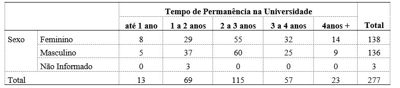 A amostra recolhida é composta por 277 respondentes, a maioria jovens entre 16-24 anos ou 25-34 e bastante equilibrada entre os gêneros (χ. = 12,95; GL = 8; Sig = 0,114). Conforme se vê na Tabela 2, há uma concentração significativa de respondentes nos anos intermediários, especialmente nas faixas que vão de um a três anos de vivência acadêmica.