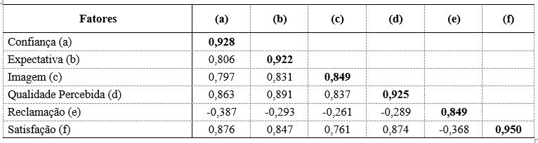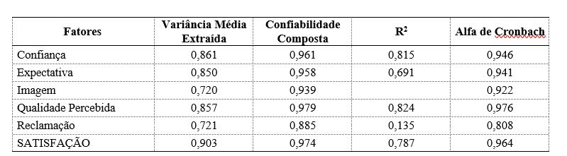 Os índices de Confiabilidade Composta e Alfas de Cronbach superaram os mínimos esperados de 0,7 em todos os fatores, e os Coeficientes de Determinação – R. das principais variáveis endógenas (confiança, qualidade percebida e satisfação) apresentam valores superiores a 0,75, ou “substancialmente explicativos” (Hair et al., 2014, p. 113). A validade discriminante foi avaliada pelo critério de Fornell e Larcker (1981), que compara o quadrado das correlações entre os fatores à AVE de cada um deles. Por este critério, existe de validade discriminante quando a AVE de cada fator supera o quadrado das correlações do próprio com os demais fatores. Conforme se vê na Tabela 4, as raízes quadradas das AVE (em negrito na diagonal principal), superam as correlações em todas das linhas e colunas correspondentes, o que atesta a existência de validade discriminante no modelo.