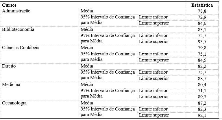 O resultado sugere que se colhermos diversas amostras aleatórias do curso de Administração da Universidade estudada, em 95% das vezes as médias flutuarão entre 72,9 e 84,6, e no curso de Oceanologia as médias flutuarão entre 82,3 e 92,1, o que não permite afastar a presunção de igualdade na satisfação de um grupo ou de outro.