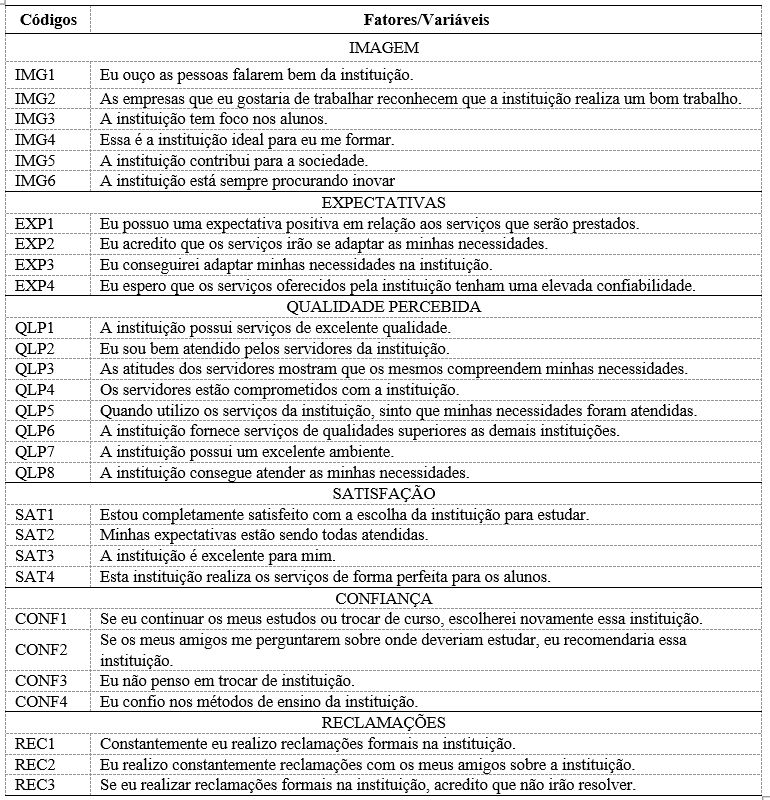 Além das questões demográficas, o instrumento original continha 29 questões avaliativas, todas elas adaptadas de trabalhos anteriores, que foram medidas numa escala de razão de 100 pontos, conforme sugerido por Fornell et al. (1996). A Tabela 1 apresenta a lista de variáveis utilizadas no levantamento: as seis variáveis da imagem foram adaptadas de Andreassen e Lindestad (1998) e de Alves e Raposo (2007), as variáveis representativas das expectativas de Fornell et al. (1996) e de (Oliver, 1980), as da qualidade percebida de Brady e Cronin (2001) e de Fornell et al. (1996), as da satisfação de Oliver (1980) e de Fornell et al. (1996), as da confiança de Sirdeshmukh, Singh e Sabol (2002) e de Terres e Santos (2013) e as da reclamação de Bayol et al. (2000).