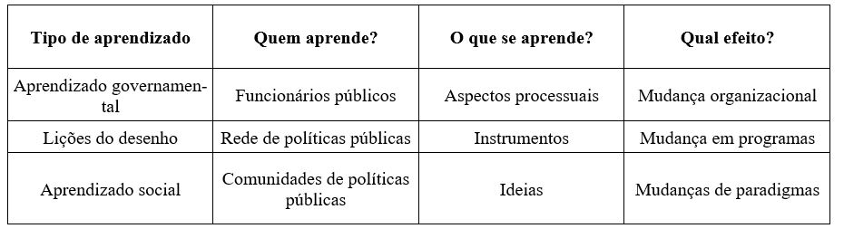 A ideia de que os governos aprendem não é nova no campo de estudos de políticas públicas (Deutsh, 1966; Heclo, 1974). Bennett e Howlett (1992) fazem um levantamento dessa literatura, cuja premissa basilar é a de que o processo decisório governamental envolve não só elementos relacionados ao conflito e ao poder. Em seu estudo, os autores identificam três camadas (ou tipos) em que pode ocorrer o aprendizado: aprendizado governamental, lições sobre o desenho e aprendizado social. Cada um desses tipos implica distinções relacionadas a quem aprende, o que se aprende e quais efeitos do aprendizado. Estudos mais recentes passaram a considerar o aprendizado em políticas públicas como um quadro analítico capaz de explicar o processo de políticas públicas (Dunlop & Radaelli, 2017, 2018).
