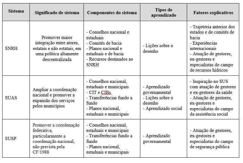 Em síntese, distintos processos de construção apontam para diferentes significados de “sistema nacional” enquanto desenho institucional das políticas públicas no Brasil. Do ponto de vista do aprendizado, os desafios de cada política no momento da adoção do desenho sistêmico, suas especificidades, suas trajetórias e as ideias dos atores que atuam no setor são elementos que influenciaram as mudanças pelas quais passaram os desenhos institucionais das três políticas e o tipo de aprendizado que eles experimentaram.