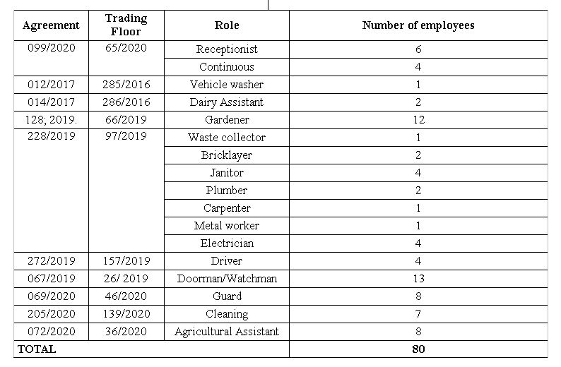 The total number of outsourcers working at UFV/CAF, 80, was reduced, at the time of data collection, due to the Covid-19 pandemic. In the quest to reduce the virus's transmissibility and save resources in the crisis, not all contracts were operating at their full capacity. The total number of employees tendered in public protocols was 109, and contracts 099/2020 (7 vacant posts), 205/2020 (17 vacant posts), and 067/2019 (5 vacant posts) were reduced.