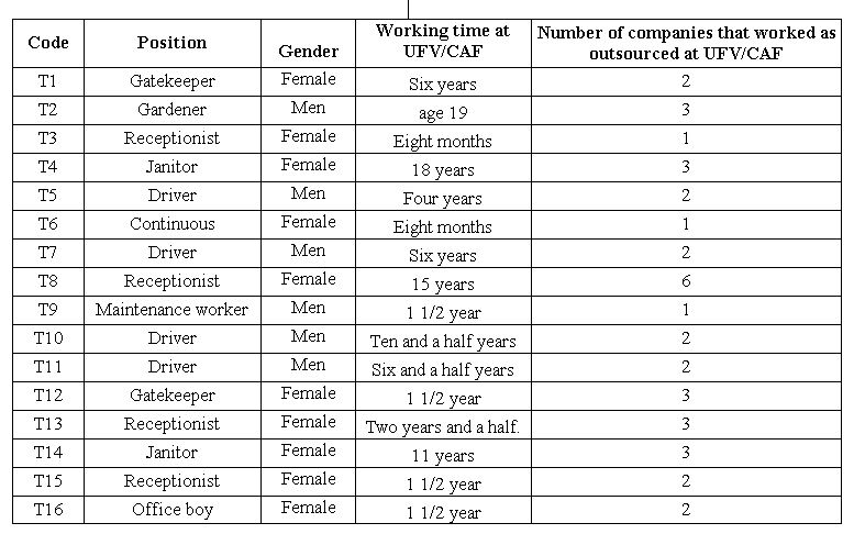 This situation reinforces the justification for studying outsourcing at UFV/CAF. In table 1, we have the profile of the outsourced employees interviewed regarding the specification of the position, gender, working time at UFV/CAF, and many companies that worked as outsourced at UFV/CAF.