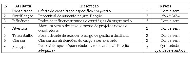 Na construção dos conjuntos de atributos, consideraram-se os sete identificados na etapa qualitativa, sendo seis com dois níveis e um com três níveis, conforme mostra o Quadro 1. Com relação à gratificação, os percentuais de 15% ou 30% foram escolhidos para representar possibilidades reais, já que um percentual maior do que 30% não seria exequível, dada a atual conjuntura de austeridade nos gastos públicos, e um percentual menor do que 15% seria pouco atrativo.