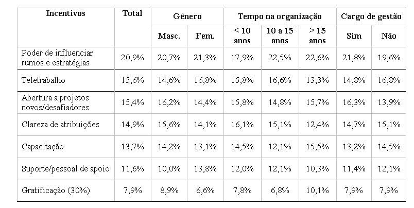 Os dados relativos às diferenças de gênero mostram que o teletrabalho é mais valorizado pelas mulheres do que pelos homens, possivelmente porque, por acumularem mais responsabilidades no cuidado com a família, entendem que a possibilidade de trabalhar em casa favoreceria o atendimento dessa dupla demanda (Hirata, 2018; Kalysh et al., 2016). As mulheres, em comparação aos homens, também dão mais valor ao suporte organizacional, na forma de pessoal de apoio em quantidade e qualidade adequadas, o que também pode ser interpretado como uma preocupação com o acúmulo de funções no trabalho e na família. Tais resultados sugerem que esses dois incentivos precisam ser levados em consideração no caso de organizações que buscam maior diversidade de gênero em funções gerenciais.