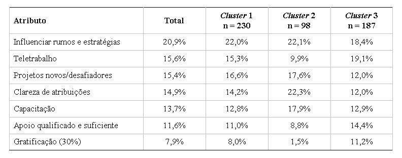 Results: The conjoint analysis, which shows the relative importance of the factors, revealed that the most important are the possibility to influence the organization’s directions and strategies and teleworking. The cluster analysis pointed to three different groups, called protagonists, cautious and pragmatics.