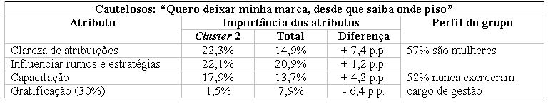 O cluster 2, dos cautelosos, valoriza os atributos “clareza de atribuições” e “capacidade de influenciar rumos e estratégias da organização”, indicando que também querem exercer certo protagonismo, mas desde que saibam o que se espera deles/delas. O grupo é formado por 57% de mulheres, o que sugere que elas podem ser mais cautelosas no momento de assumir funções gerenciais. Além disso, 52% nunca exerceram cargos de gestão, o que também contribuiria para explicar essa maior cautela (ver Tabela 4). Cumpre ainda destacar que os integrantes desse grupo são os que menos valorizam a recompensa financeira adicional pela posição de gestão.
