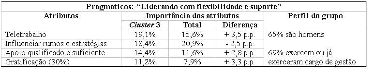 Por fim, o cluster 3 é composto pelos pragmáticos, dado que valorizam mais – em relação à amostra total – o “teletrabalho”, o “apoio qualificado e suficiente” e a “gratificação”. Esses resultados, apresentados na Tabela 5, sugerem que os pragmáticos estariam dispostos a assumir uma função gerencial desde que isso não comprometa sua qualidade de vida e que recebam uma recompensa financeira condizente com as responsabilidades do cargo.