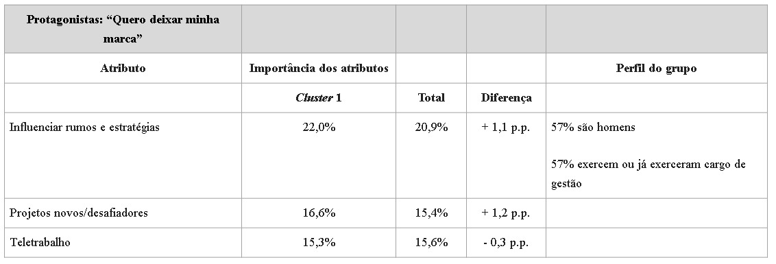 Cada grupo recebeu um nome e uma frase definidora para caracterizar seus aspectos mais marcantes. O cluster 1 corresponde ao grupo dos protagonistas, porque os dois atributos mais valorizados são “capacidade de influenciar rumos e estratégias da organização” e “possibilidade de trabalhar em projetos novos e desafiadores”. O grupo é majoritariamente formado por homens com experiência em gestão (ver Tabela 3). Para esse grupo, portanto, é importante exercer o protagonismo, lidar com desafios e ter a oportunidade de direcionar os rumos da organização, ou seja, deixar a própria marca durante sua gestão.