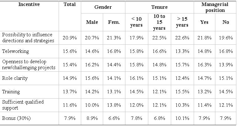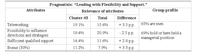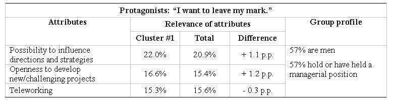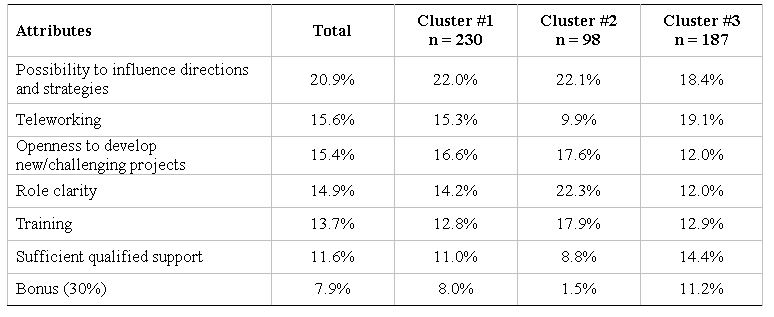 Results: The conjoint analysis, which shows the relative importance of the factors, revealed that the most important are the possibility to influence the organization’s directions and strategies and teleworking. The cluster analysis pointed to three different groups, called protagonists, cautious and pragmatics.