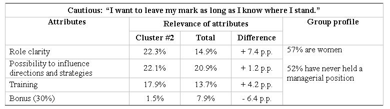 Cluster #2, the group with the cautious managers, values the attributes “role clarity” and “possibility to influence the organization’s directions and strategies,” indicating that they also want to play a leading role provided they know what is expected of them. The group is formed by 57% of women, suggesting they may be more cautious when assuming managerial roles. In addition, 52% have never held a managerial position, which would also contribute to explaining their greater caution (see Table 4). It should also be noted that members of this group are the least likely to value the additional financial rewards of a managerial position.