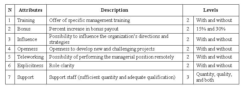 Therefore, this study investigates the motivations behind the career transition from a technical to a managerial position. The research was developed in two stages, one qualitative and the other quantitative. The first allowed us to identify seven relevant attributes to such a transition. In the quantitative stage, which is the focus of this article, we sought to evaluate the relative importance of these factors on the decision to assume a managerial role in this specific organization.