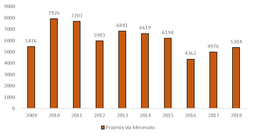 Das propostas do Mecenato, 59.957 tiveram algum valor aprovado, o que corresponde a 97,55% das propostas. Do total de projetos aprovados, 18.959 conseguiram captar recursos, correspondendo a 31,62% dos projetos aprovados.