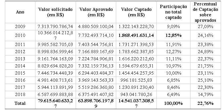 Aspectos políticos e alterações no marco legal da lei podem influenciar os números da LIC ao longo dos anos. A Tabela 1 apresenta a relação de valores solicitados, aprovados e captados no período analisado.