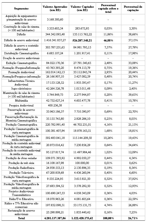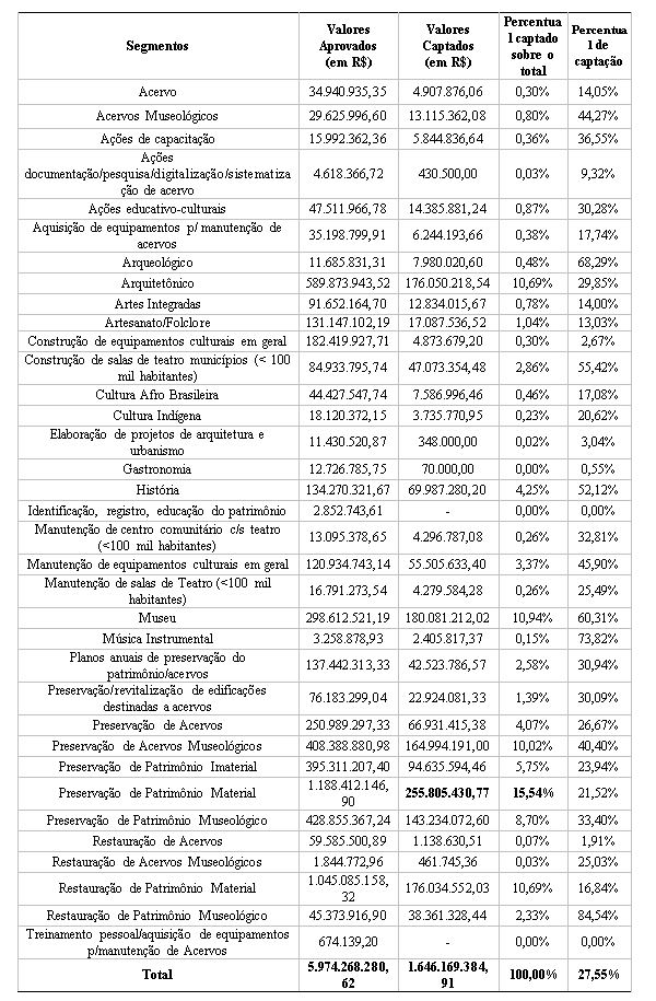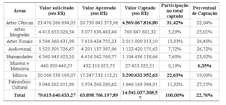 Os projetos culturais podem ser de áreas culturais diversas, que são agrupadas em segmentos específicos. Para se compreender a especificidade e a natureza dos objetos presentes nos projetos culturais, estes são produzidos seguindo algumas regras, sendo resultados diretos da estrutura regulatória existente (Thiry-Cherques, 2006). A Tabela 2 ilustra a quantidade de recursos e a proeminência de algumas áreas na aprovação e captação de recursos (Sá-Earp et al., 2016).
