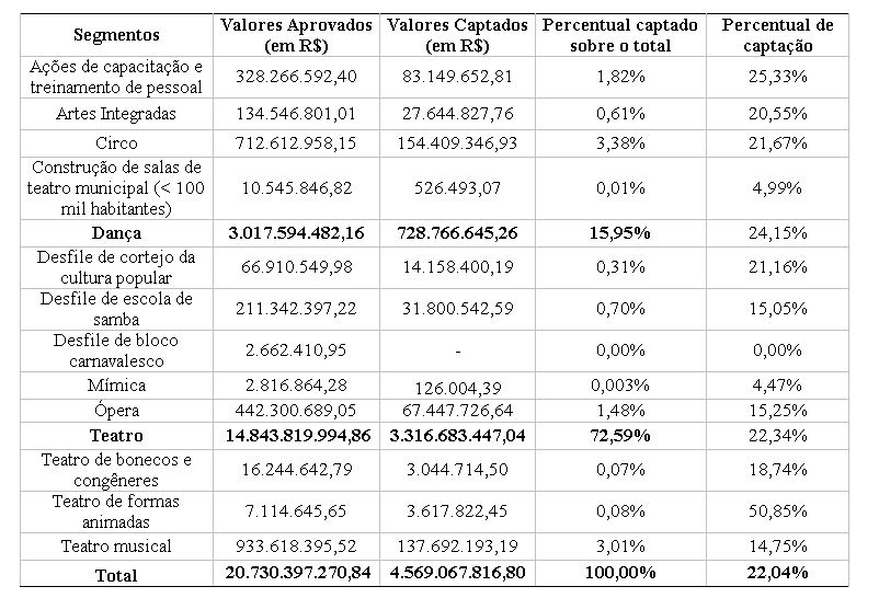 Dentre as áreas contidas na Tabela 2, as Artes Cênicas contam com 31,42% do total de recursos captados. Contando com 17.942 projetos aprovados, nessa área 6.243 projetos foram efetivados através da LIC. A área se divide em alguns segmentos culturais (Tabela 3).